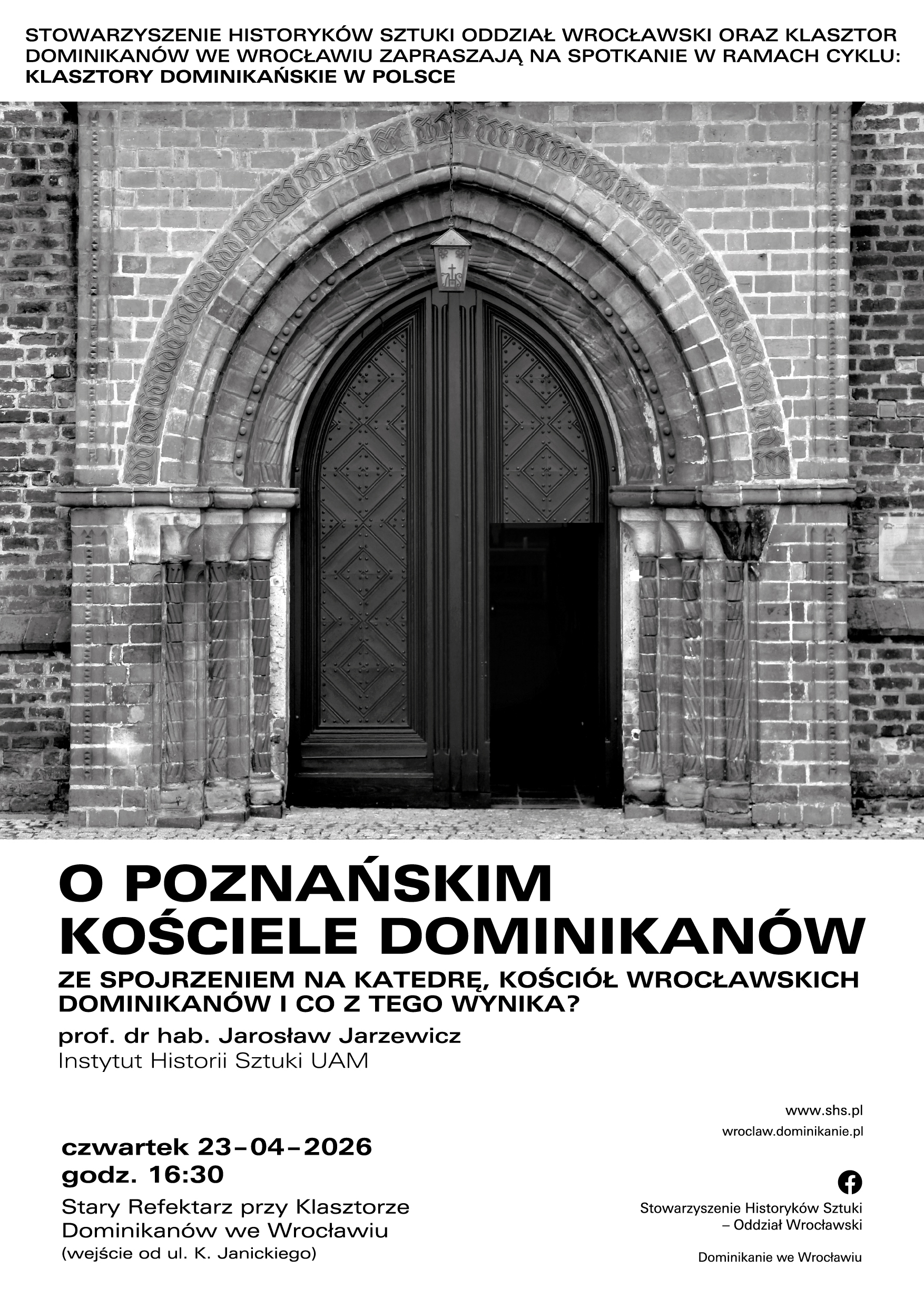 Szanowni Państwo, Wspólnie z Klasztorem Dominikanów we Wrocławiu serdecznie zapraszamy na wykład prof. dr. hab. Jarosława Jarzewicza z Instytutu Historii Sztuki UAM „O poznańskim kościele Dominikanów ze spojrzeniem na katedrę, kościół wrocławskich dominikanów i co z tego wynika?”, kolejne spotkanie w ramach cyklu „Klasztory dominikańskie w Polsce”. Spotkanie odbędzie się w czwartek 23.04.2026 o godz. 16.30 w Starym Refektarzu przy Klasztorze Dominikanów we Wrocławiu (wejście od ul. K. Janickiego)