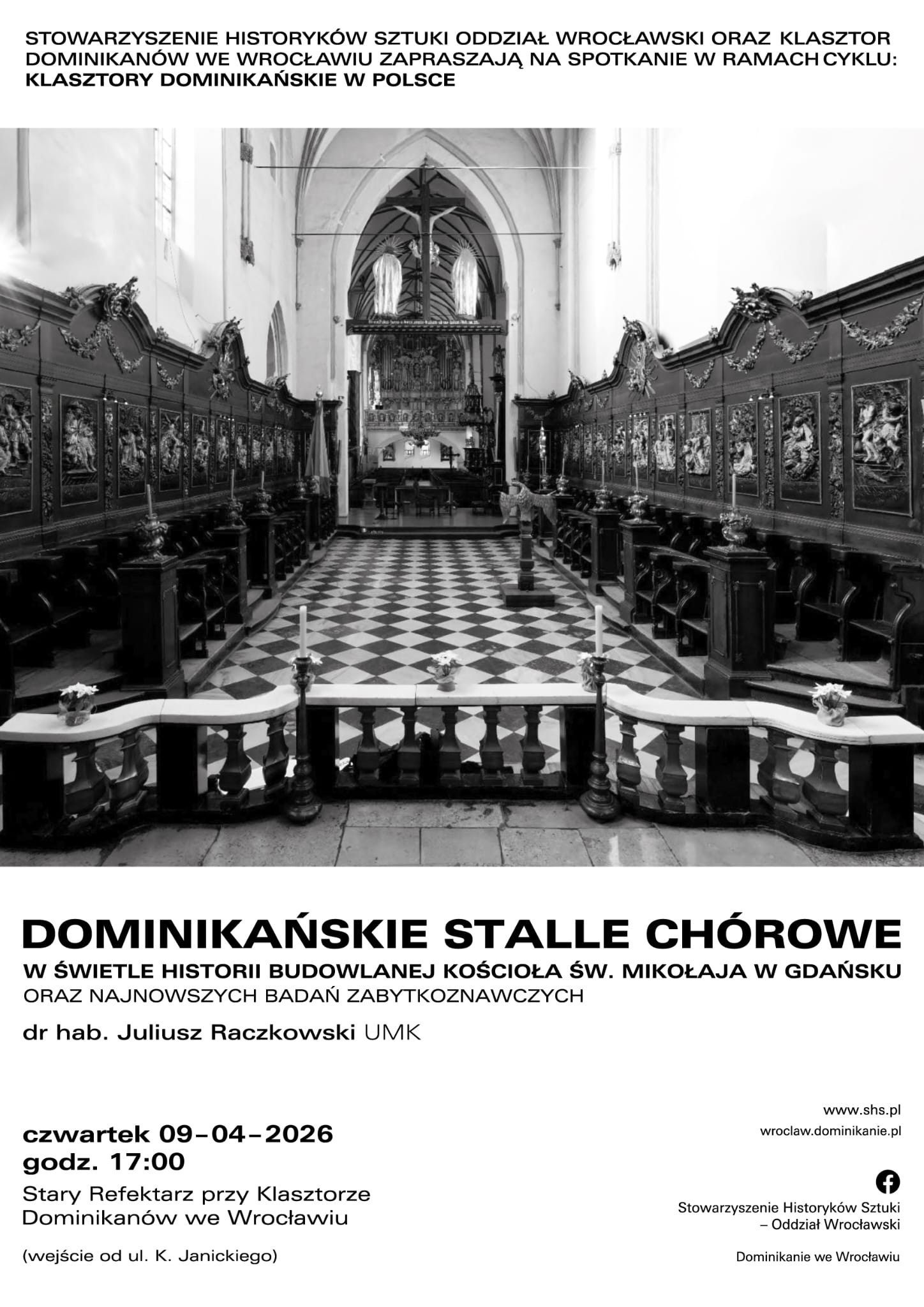 Oddział Wrocławski Stowarzyszenia Historyków Sztuki wspólnie z Klasztorem Dominikanów we Wrocławiu serdecznie zaprasza na wykład dr. hab. Juliusza Raczkowskiego z Uniwersytetu Mikołaja Kopernika w Toruniu „Dominikańskie stalle chórowe w świetle historii budowlanej kościoła św. Mikołaja w Gdańsku oraz najnowszych badań zabytkoznawczych“, kolejne spotkanie z cyklu „Klasztory dominikańskie w Polsce”.
